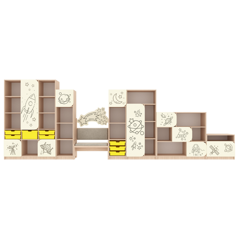 Rafturile și ușile sunt realizate din un pasa laminat de grosime de 16 mm. Marginile frontale sunt finisate cu bandă de margine din PVC de o grosime de 1 mm, marginile altor piese sunt finisate cu bandă de margine din PVC de 0,5 mm grosime. Peretele din spate este realizat din HDF alb unilateral de o grosime de 2,5 mm. Peretele este echipat cu tăvi de Gratnells din seria N1 și N2, care sunt fixate cu ghiduri din plastic. Imprimarea fotografiei se efectuează pe PAL folosind cerneluri speciale care se întăresc sub acțiunea lămpilor speciale cu ultraviolete. Pictura în sine este, de asemenea, acoperită cu lac pentru a crește rezistența sa la deteriorarea externă, abraziunea și curățarea umedă. Spatele scaunului și scaunul băncii sunt umplute cu spumă de o grosime de 30 mm și sunt acoperite cu țesătură. Accesorii: minifixe, șuruburi euro.