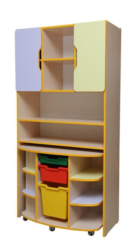 Elementul este destinat mobilării grădinițelor și a școlii de juniori. Este funcțional și este destinat depozitării materialelor didactice, cărților, dosarelor, bunurilor personale ale copiilor. Elementul este realizat din pal laminat de o grosime de 16 mm. Peretele din spate este realizat din HDF alb unilateral de o grosime de 2,5 mm. Bland: bandă galbenă de margine din PVC de 1 mm grosime. Piesele de schimb și componentele de înaltă calitate sunt utilizate în timpul fabricării elementului, ceea ce simplifică procesul de asamblare și dezasamblare și, de asemenea, permit să-l facă de multe ori și fără deteriorarea elementelor de fixare. Elementele de fixare au o acoperire decorativă de protecție.