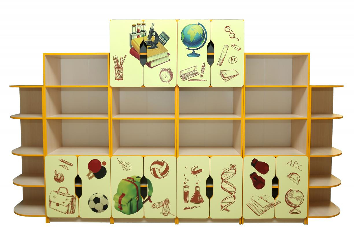 Carcasa și partea din față a unității de perete sunt realizate din un pal laminat de o grosime de 16 mm. Zidul este destinat mobilării grădinițelor și a școlilor de juniori, este posibilă o combinație diversă de elemente. Peretele este funcțional și destinat stocării materialelor didactice, a cărților, a dosarelor și a bunurilor personale ale copiilor. Peretele din spate este realizat din HDF alb unilateral de o grosime de 2,5 mm. Bland: bandă galbenă de margine din PVC de 1 mm grosime. Fotografia cu tema școlii este implementată pe pal de pilotaj cu ajutorul cernelii speciale, care se întărește sub impactul emisiei lămpilor cu ultraviolete speciale. Există, de asemenea, tehnologia de acoperire cu lac al imaginii pentru creșterea rezistenței la daunele exterioare, abraziune și curățarea umedă. Piesele de schimb și componentele de înaltă calitate sunt utilizate în timpul fabricării unității de perete, care simplifică procesul de asamblare și dezasamblare și, de asemenea, permit să o facă de multe ori și fără deteriorarea elementelor de fixare. Elementele de fixare au o acoperire decorativă de protecție.
