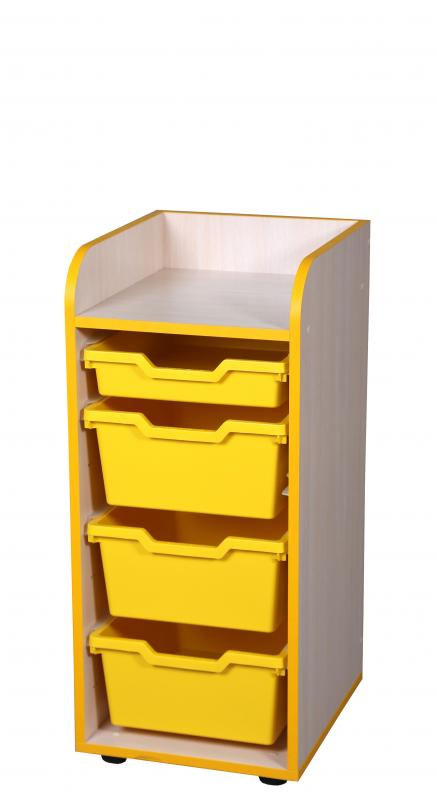 Unitatea de depozitare a copiilor pentru tăvi este fabricată din pal laminat de o grosime de 16 mm. Peretele din spate este realizat din HDF alb unilateral de o grosime de 2,5 mm. Unitatea de perete este completată cu tăvi, care sunt fixate cu ajutorul șinelor speciale din plastic de formă specială pentru tava de plastic, pentru a evita răsturnarea și căderea acesteia. Șinele din plastic au înălțarea specială de înțepături de fixare (analog de deținător de raft) pe baza sa pentru posibilitatea instalării lor fără șuruburi sau șuruburi autoexploatate. În plus, tăvile pot fi echipate cu capace din plastic care oferă o protecție suplimentară a conținutului tăvii