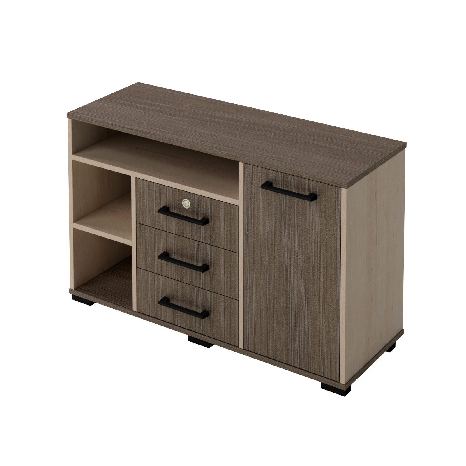 Lateralele mesei laterale, rafturile, fronturile sertarului și ușa sunt realizate din pal laminat de grosime de 18 mm. Părțile frontale și vizibile  sunt finisate cu bandă de margine din PVC de 1 mm grosime, alte părți sunt finisate cu bandă de margine din PVC de o grosime de 0,5 mm. Partea inferioară a sertarelor este realizată din HDF alb unilateral de o grosime de 2,5 mm. Dulapul are o uşă şi trei sertare. Cel mai bun sertar are o încuietoare. Există, de asemenea, trei rafturi deschise. Accesorii: mânere de mobilier din plastic negru, suporturi de mobilier din plastic negru, minifixe, șuruburi euro, ghiduri cu bile de extensie completă, blocarea mobilierului.