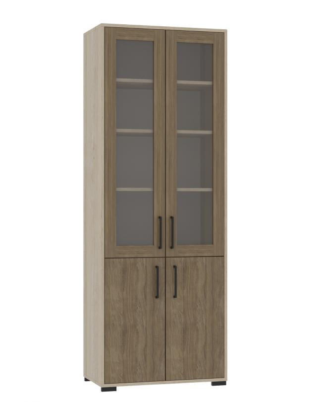 Cadrul dulapului, rafturile încorporate și ușile sunt realizate din un pal laminat de grosime de 18 mm. Fața este finisată cu bandă de margine din PVC de 0,8 mm grosime, alte părți sunt finisate cu bandă de margine din PVC de grosime de 0,4 mm. Peretele din spate este realizat din HDF alb unilateral de o grosime de 2,5 mm. Dulapul are 5 rafturi, 4 dintre ele sunt închise de ușile de sticlă cu sticlă albă . Culori : combinație de artizanat de fag perlat și stejar urban de cafea (față).