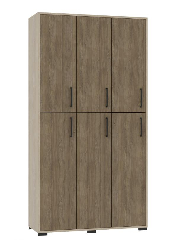 Cadrul dulapului și ușilor este fabricat din un pal laminat de grosime de 18 mm. Fațada este finisată cu bandă de margine din PVC de 0,8 mm grosime, alte părți sunt finisate cu bandă de margine din PVC de grosime de 0,4 mm. Peretele din spate este realizat din HDF alb unilateral de o grosime de 2,5 mm. Dulapul este împărțit în 6 secțiuni. Fiecare secțiune are două cârlige. Culori : combinație de artizanat de fag perlat și stejar urban de cafea (față). Accesorii: mânere de mobilier din plastic negru, suporturi de mobilier din plastic negru, minifixe, șuruburi euro, mici cârlige de mobilier cromat.
