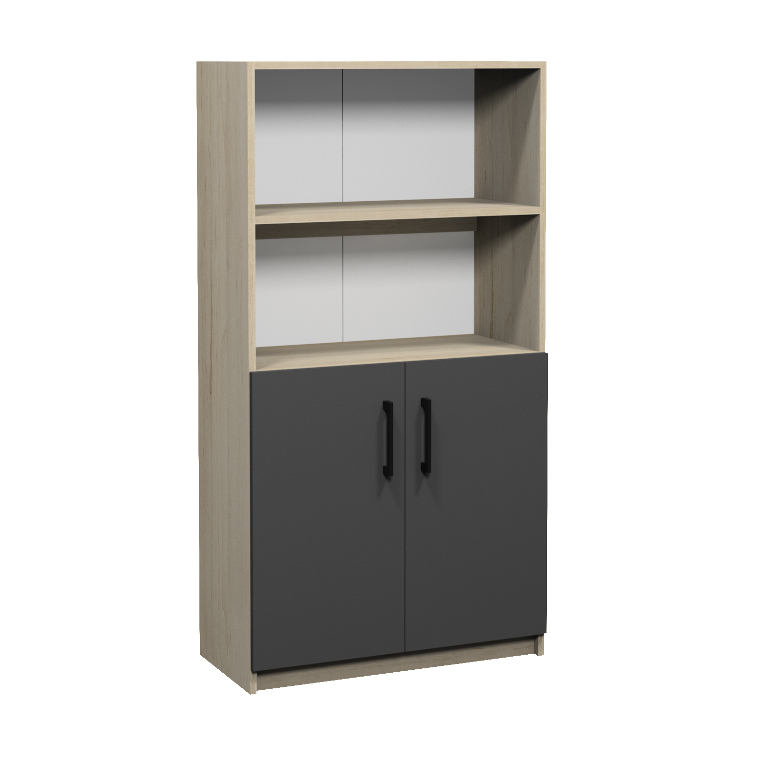 Dulapul cu două uși și rafturi deschise este fabricat din un pal laminat de grosime de 18 mm. Marginile din față sunt finisate cu bandă de margine din PVC de grosime de 1 mm. Marginile cadrului sunt finisate cu bandă de margine PVC de 0,5 mm grosime. Peretele din spate este realizat din HDF alb unilateral de o grosime de 2,5 mm. Garderoba are 2 rafturi închise și 2 deschideți. Se asigură ajustarea la înălțime a rafturilor închise. Dulapul este instalat pe suporturi metalice care sunt reglabile în înălțime de la 0 la 30 mm, care permit ca dulapul să fie plasat uniform pe o podea neuniformă.