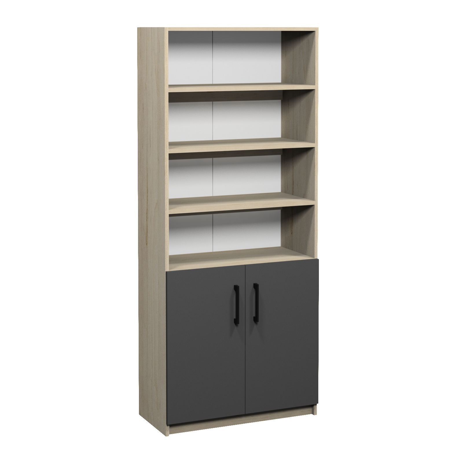 Dulapul cu două uși și rafturi deschise este fabricat din pal laminat de 18 mm grosime. Fațada este acoperită cu margini din PVC de o grosime de 1 mm; celelalte piese de plută - 0,5 mm. Peretele din spate este realizat din HDF de 2,5 mm alb. Dulapul are 2 rafturi închise și 4 rafturi întărite deschise. Înălțimea rafturilor închise este reglabilă. Dulapul este echipat cu suporturi metalice care sunt reglabile în înălțime de la 0 la 30 mm și permit plasarea acestuia pe o podea neuniformă.